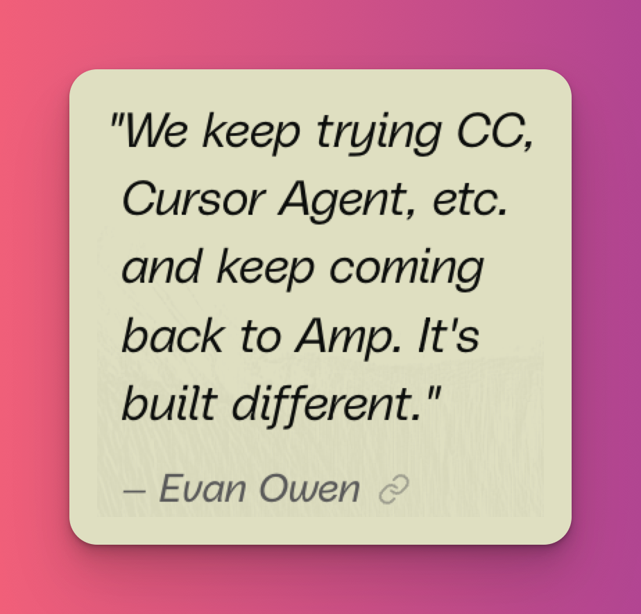 What remains constant is how much I like the Amp experience - even after honestly trying out Claude Code & Codex (OpenAI). I’m not the only one. Here’s a Tweet linked from their home page.